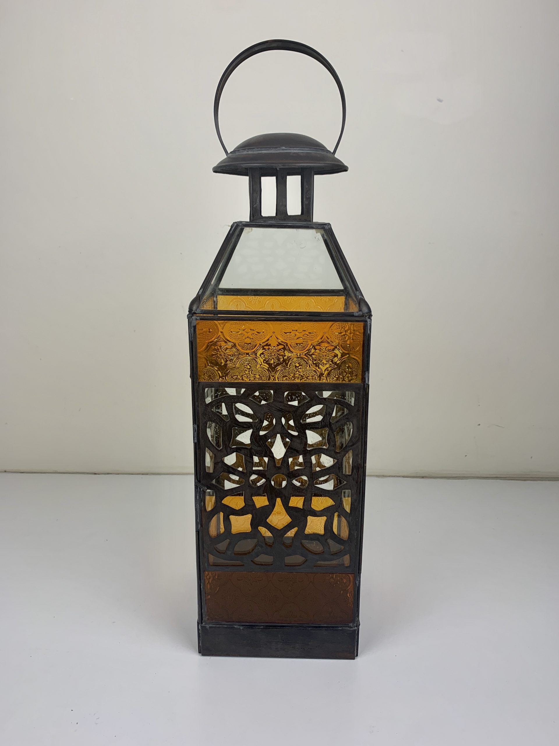 Moroccan Brass Standing Lantern with Orange Glass Inlay